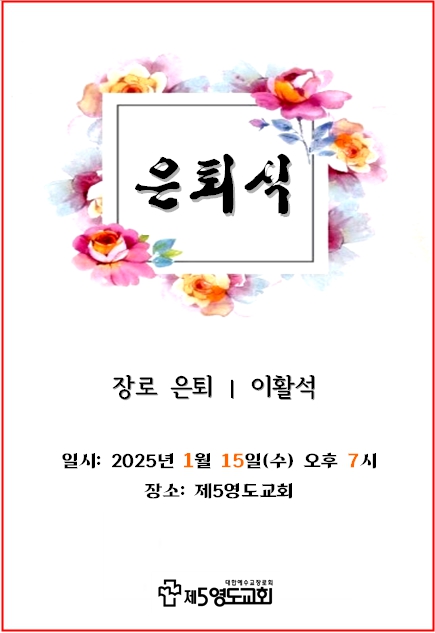 이활석 장로 은퇴식 페이지 정보 작성자 제5영도교회 작성일 25-01-25 11:47 조회 292회 댓글 0건 본문 이활석 장로 은퇴식 이전글2025 중고등부SFC 겨울 수련회 다음글2025년 중직자 세미나 목록 댓글목록 0 댓글목록 등록된 댓글이 없습니다.